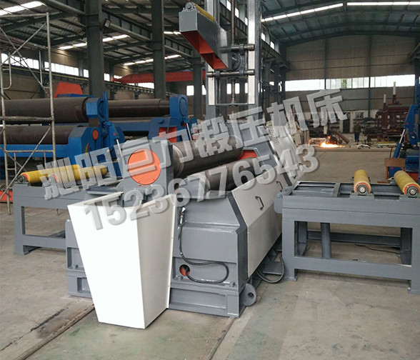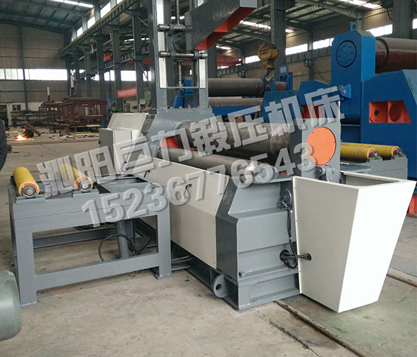 該四輥卷板機與對稱三輥卷板機比較,它可以不借助其它設備模具,直接予彎板材端部,而且剩余直邊較??;它可以不使板材調頭,而卷成工件。